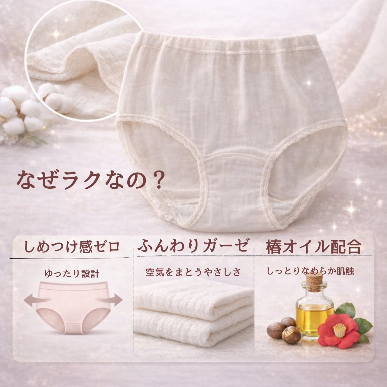 肌に優しいダブルガーゼと椿オイルを贅沢に配合したこのショーツは、毎日の安心をお届けするアイテムです。心地よさと機能性を兼ね備えたこの商品を、ぜひお試しください。