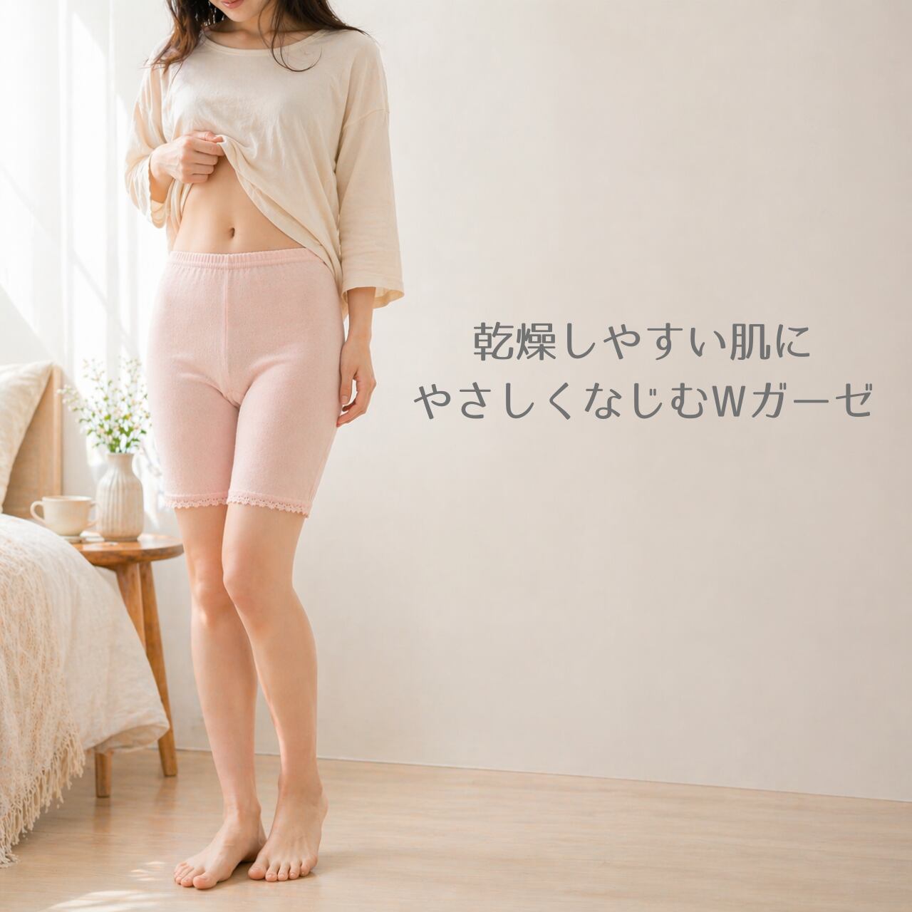 椿オイル 配合 Wガーゼ インナー 五分丈 ボトム レディース 下着 綿 コットン やさしい 肌ざわり 敏感肌 締め付けない フィット 日本製 インナーパンツ ペチコート 防寒 冷え対策 ナチュラル ベージュ ピンク ラベンダー